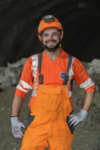 En ce moment, je travaille au sein d’une équipe de production au niveau du front sur un ouvrage en cours d’excavation à 4 kilomètres de l’entrée de la descenderie : dans un premier temps, des équipes réalisent un tir à l’explosif puis une purge et le marinage des matériaux abattus sont réalisés. Ensuite, un géologue et un topographe font des relevés du front ; c’est à ce moment-là que notre équipe intervient. Mon rôle est de préparer le robot béton et de réaliser un bétonnage de confinement de 10 centimètres pour renforcer le terrain afin de permettre aux équipes suivantes de continuer à travailler en toute sécurité. Suite à cette 1ère phase de béton projeté, une autre équipe vient mettre en place un système de soutènement, puis selon les aléas géologiques, mon équipe peut être de nouveau mobilisée pour réaliser une 2ème phase de béton projeté avant le prochain tir.
