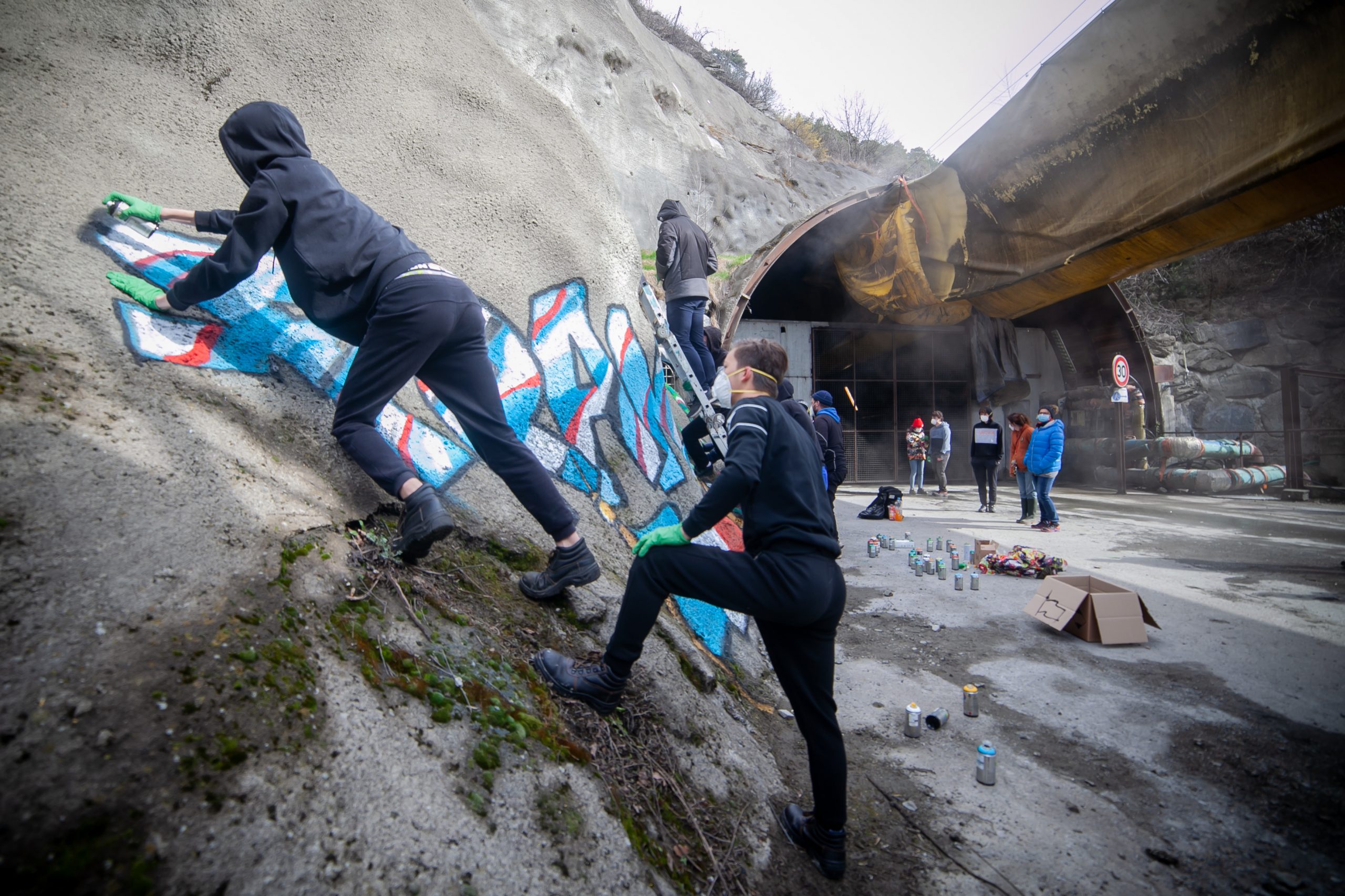 Armés d’une cinquantaine de bombes de peinture, les artistes en herbe ont illustré, à leur manière, le lien entre la France et l’Italie qui unit encore aujourd’hui un grand nombre de Mauriennais. En à peine plus de trois heures un graffiti au nom des deux pays est venu colorer de bleu, de blanc, de rouge et de vert, l’entrée de la descenderie de La Praz, comme un clin d’œil au groupement qui arrivera sur le site prochainement pour les travaux du lot C06-07 du tunnel de base.