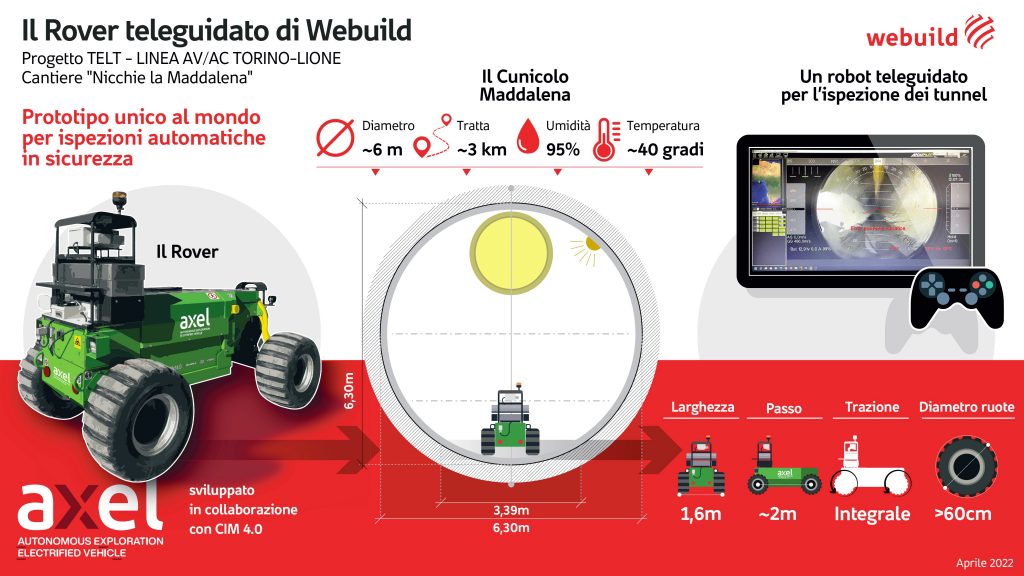 Si tratta di un sistema a guida remota altamente innovativo, il primo al mondo in grado di sostituire l’uomo nell’esplorazione di tratte di cunicoli e gallerie. Axel, nome ispirato al protagonista del romanzo Viaggio al centro della Terra di Verne, è frutto della collaborazione tra il Gruppo Webuild e il centro di eccellenza CIM 4.0.
